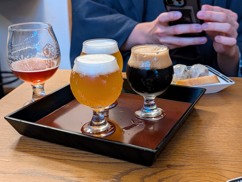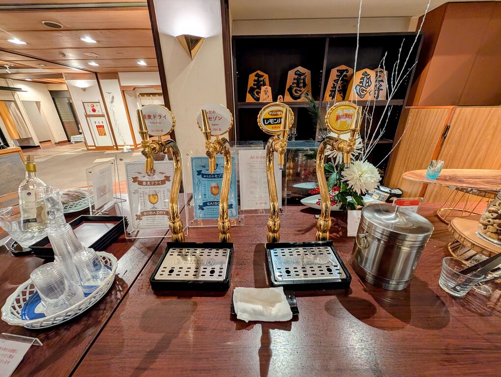 今回の宿泊先は湯坊いちらくTENDOさんで、敷地内にビールの醸造所があるとのこと。エントランスの受付前にビールサーバーがあるだけでなくワイン、日本酒、その他のお酒もいきなり飲み放題になっていました。